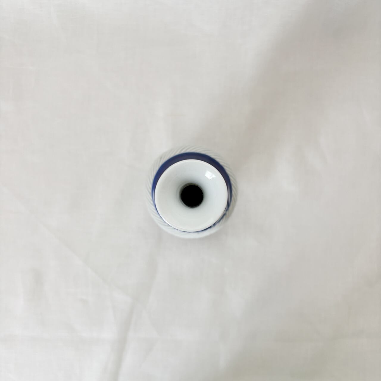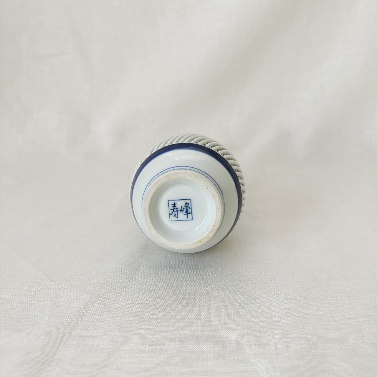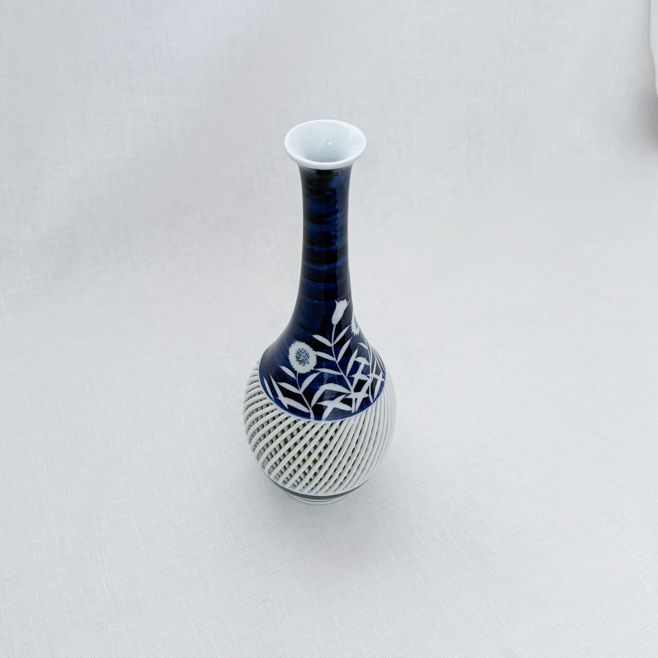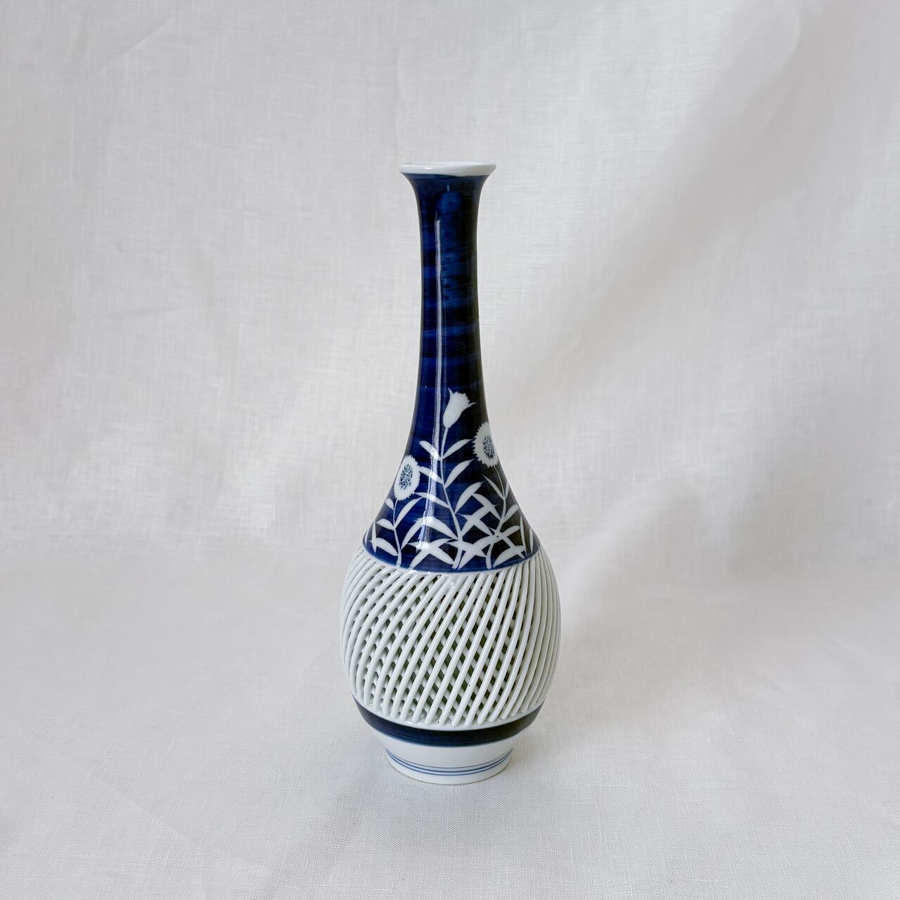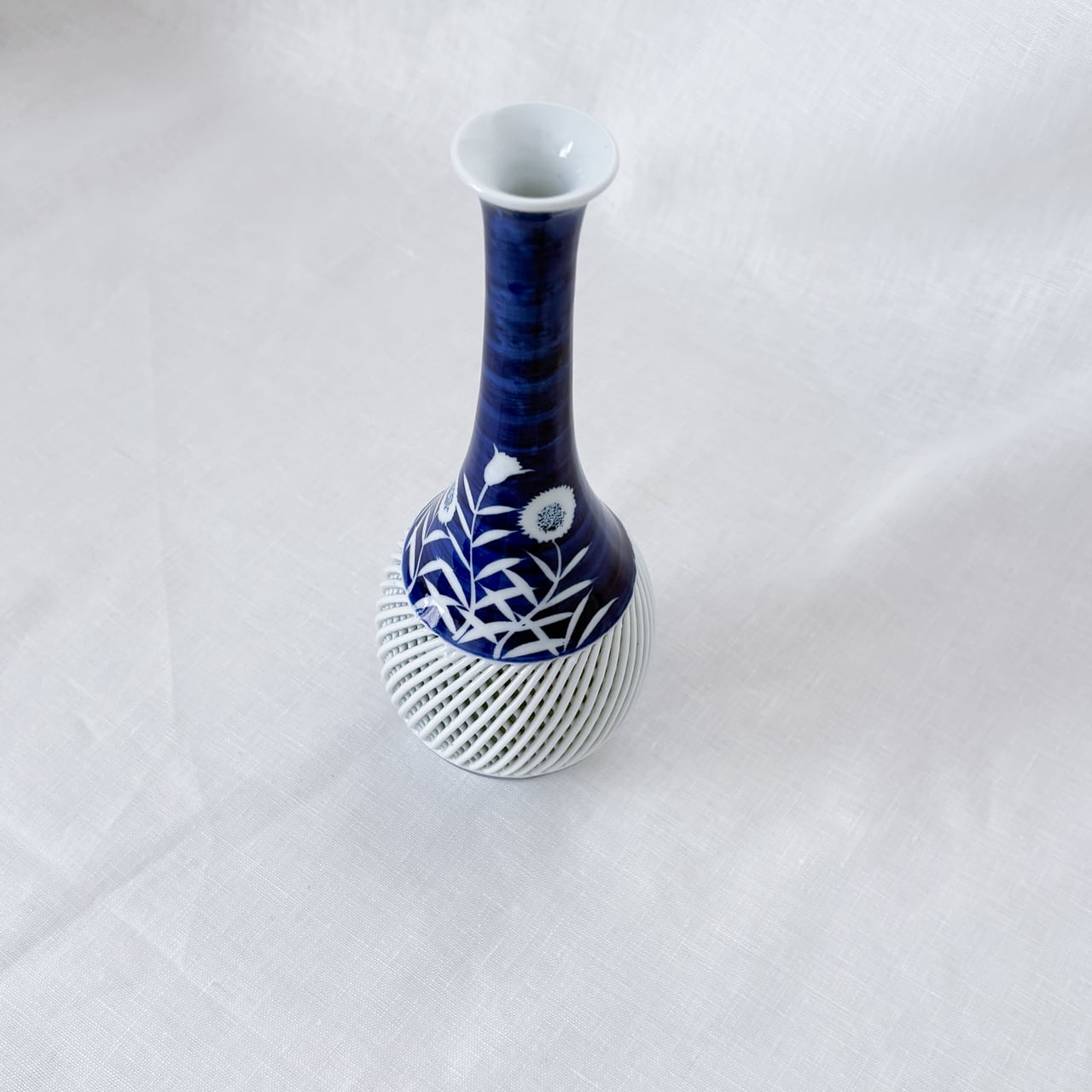 深みのある藍色に、繊細な透かし模様が美しい花瓶です。