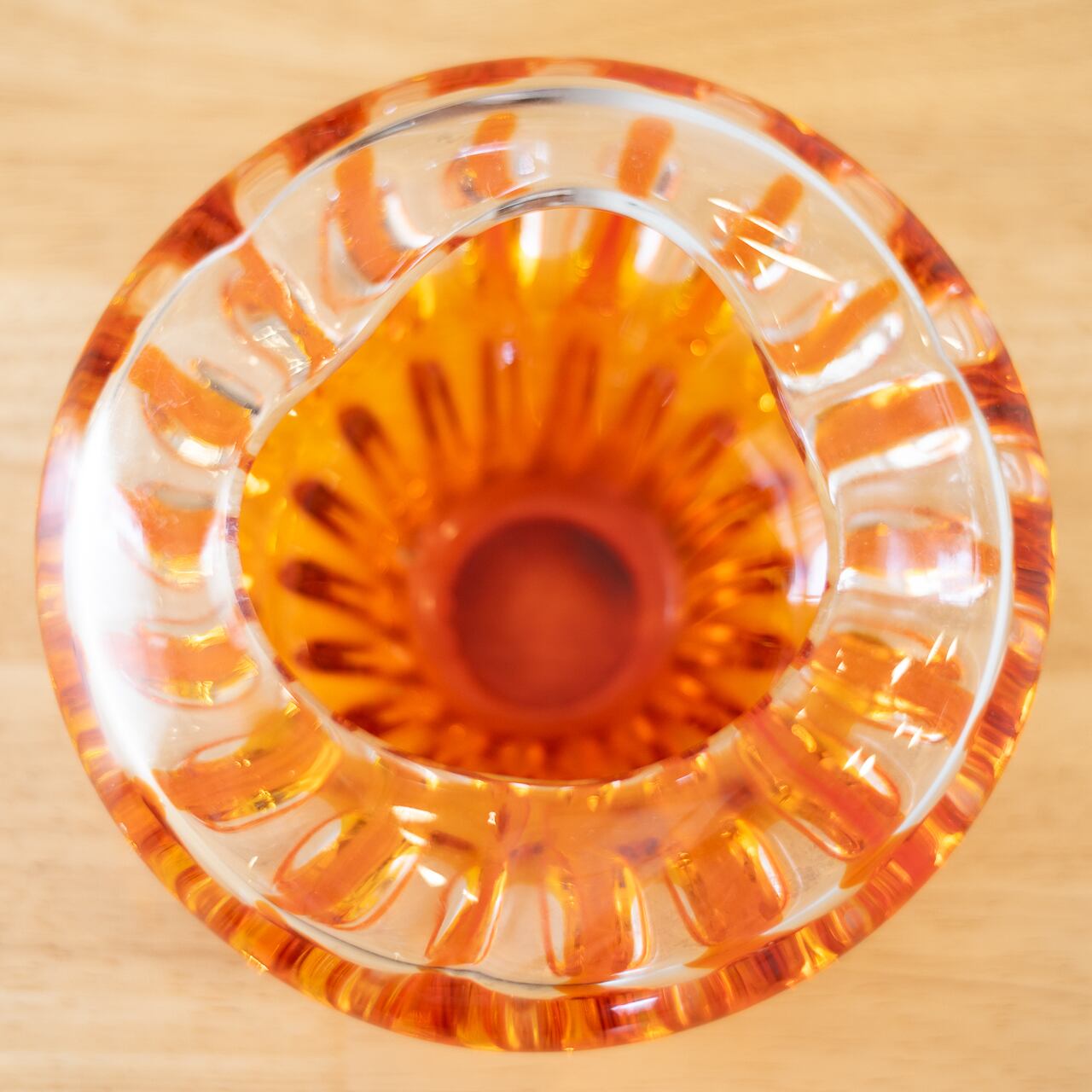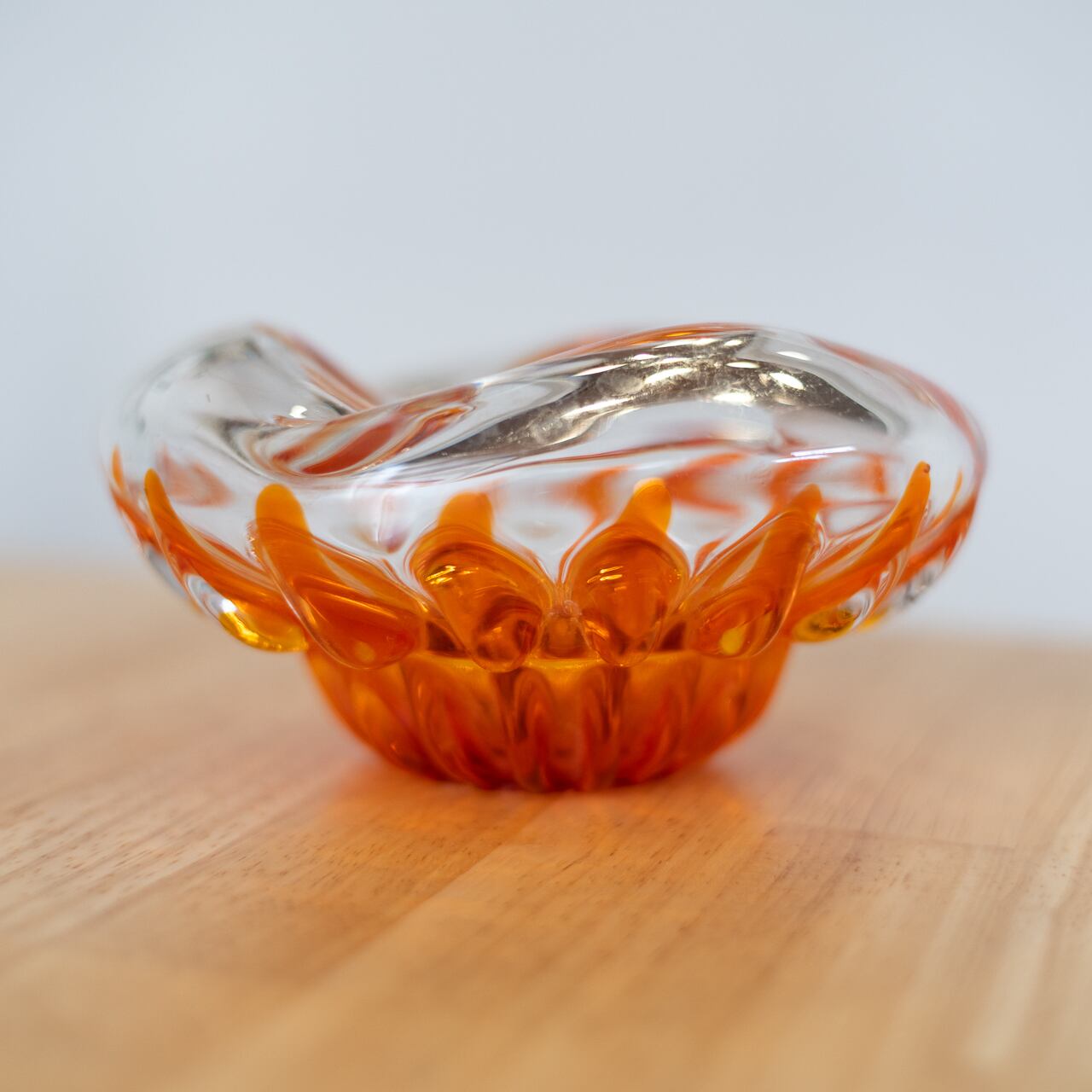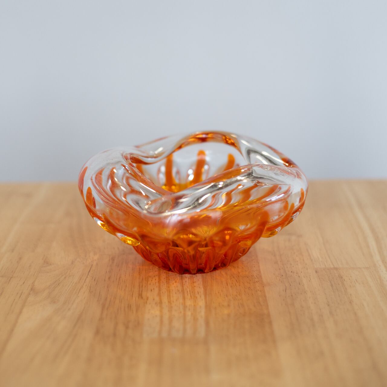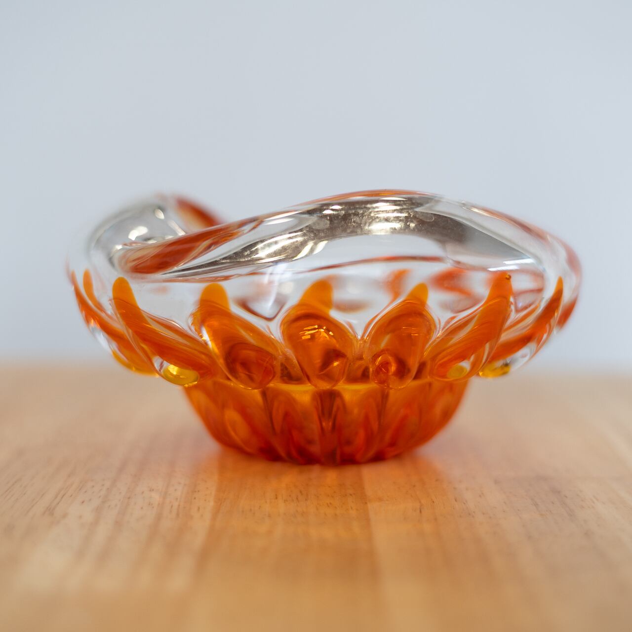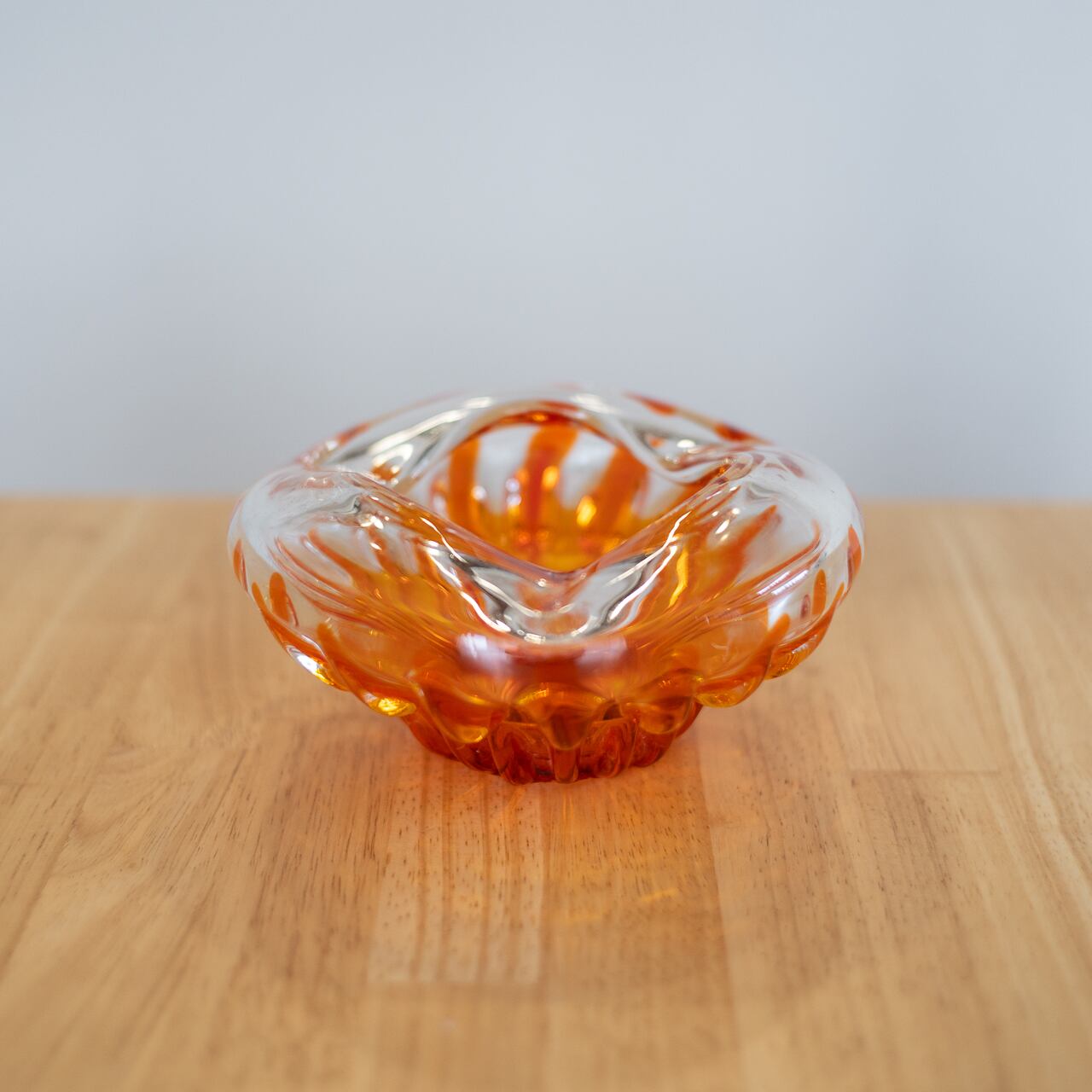 オレンジの光が透けるような構造が印象的なガラスの器です。