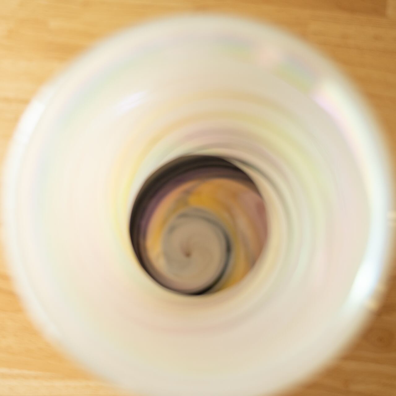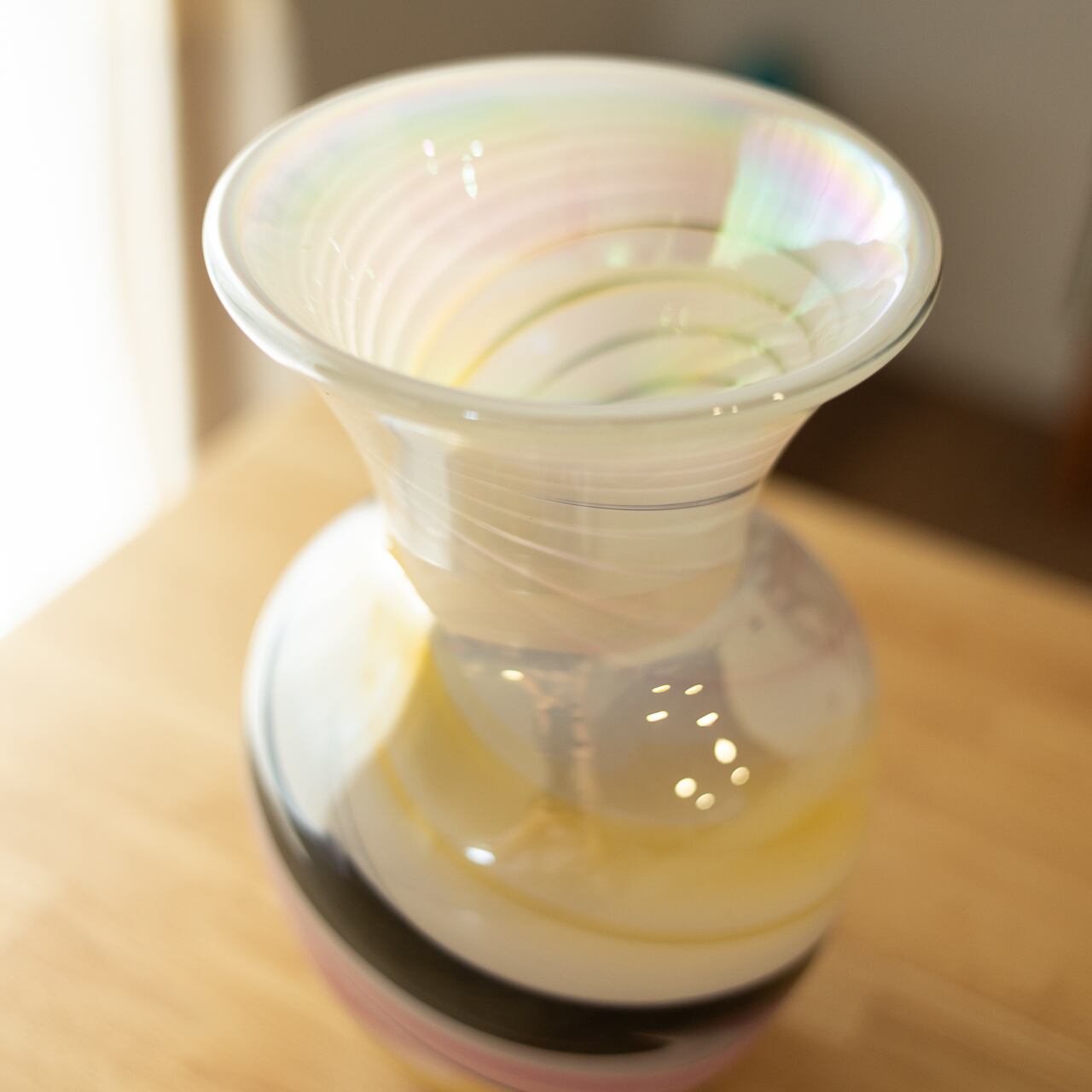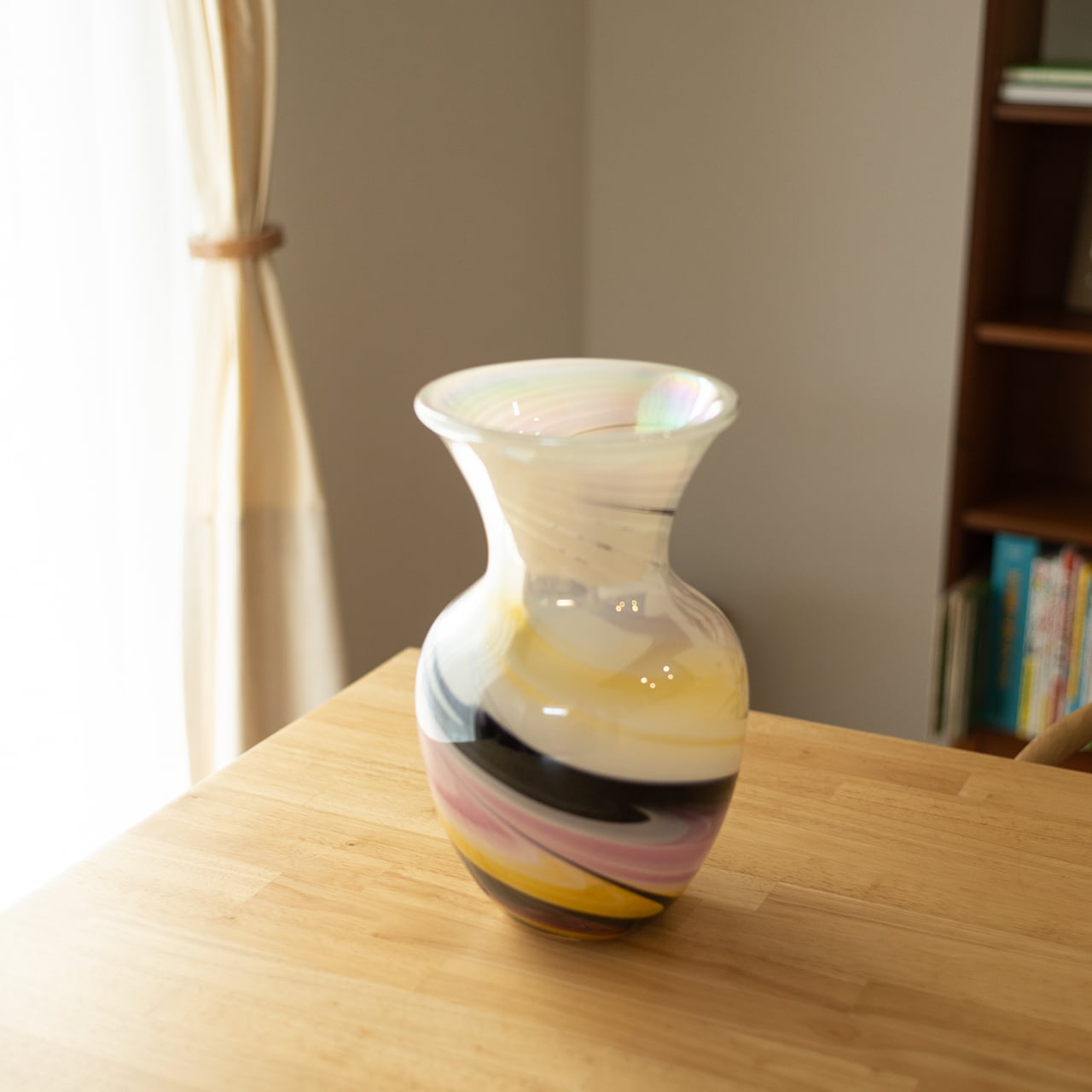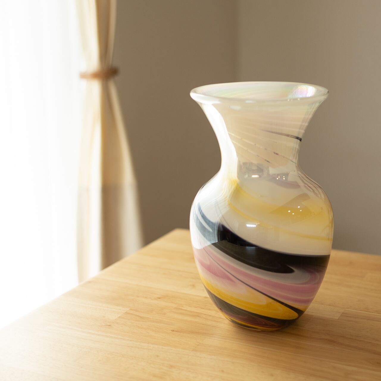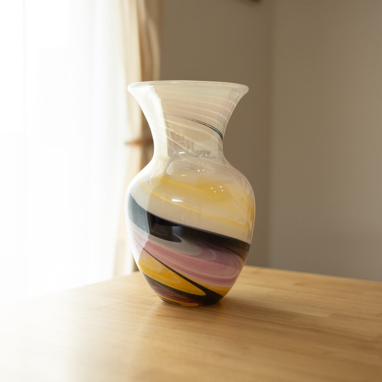 色の層が美しく溶け合う、マーブル模様のアートガラス花瓶です。