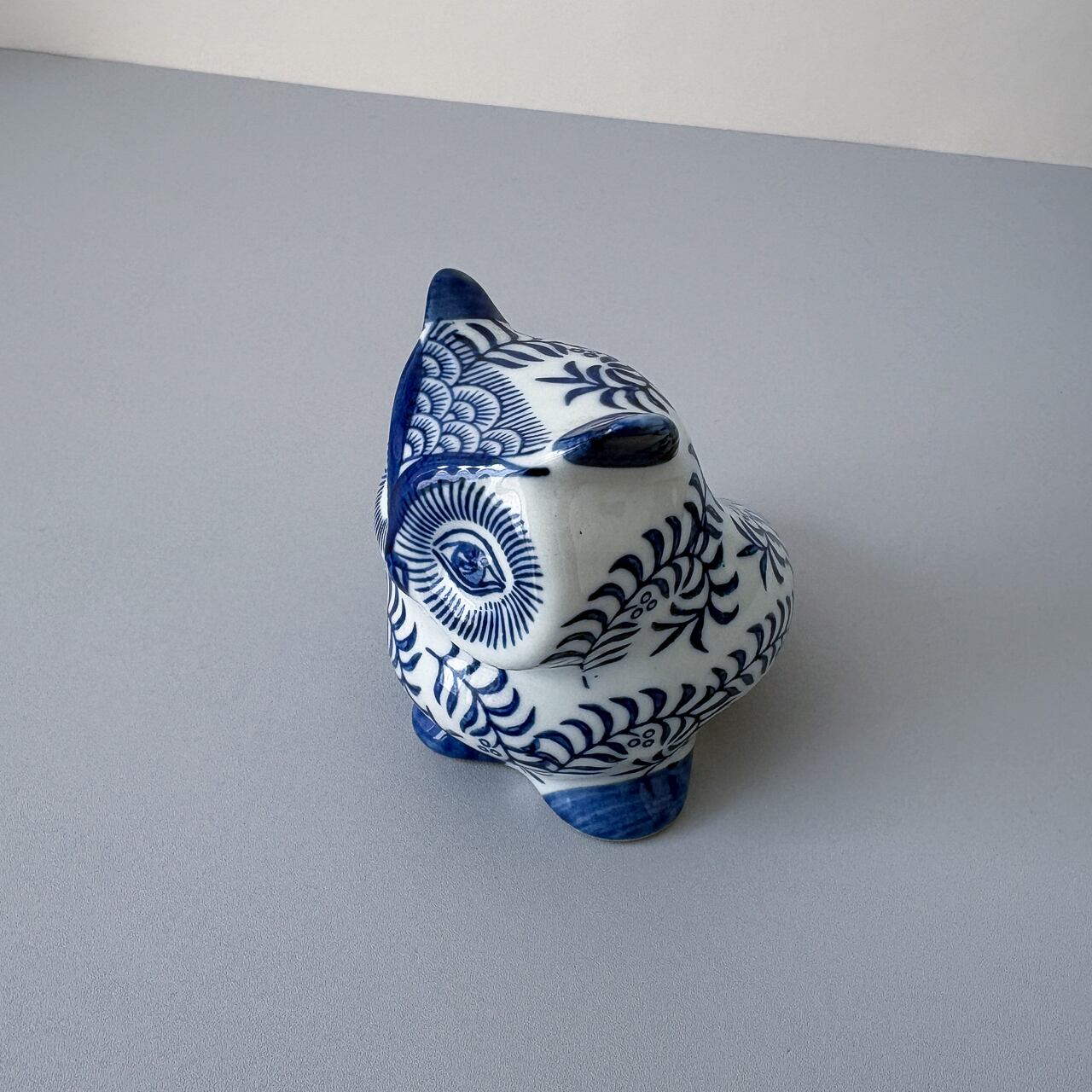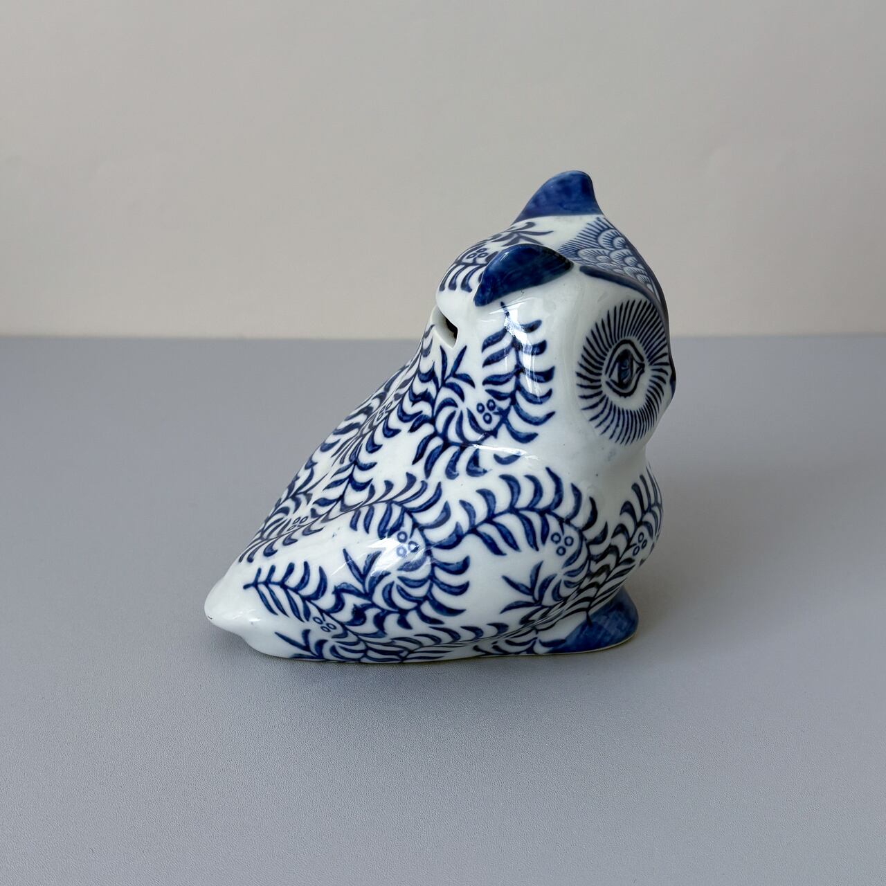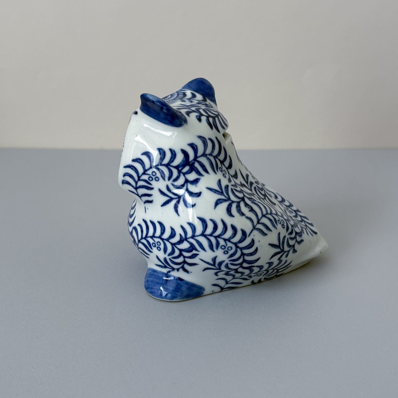 白地に青の蔦柄が美しい、フクロウの貯金箱です。