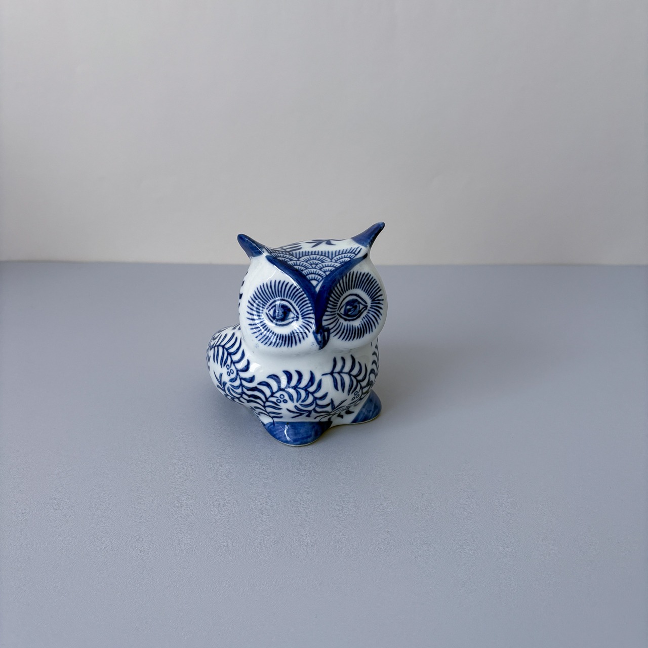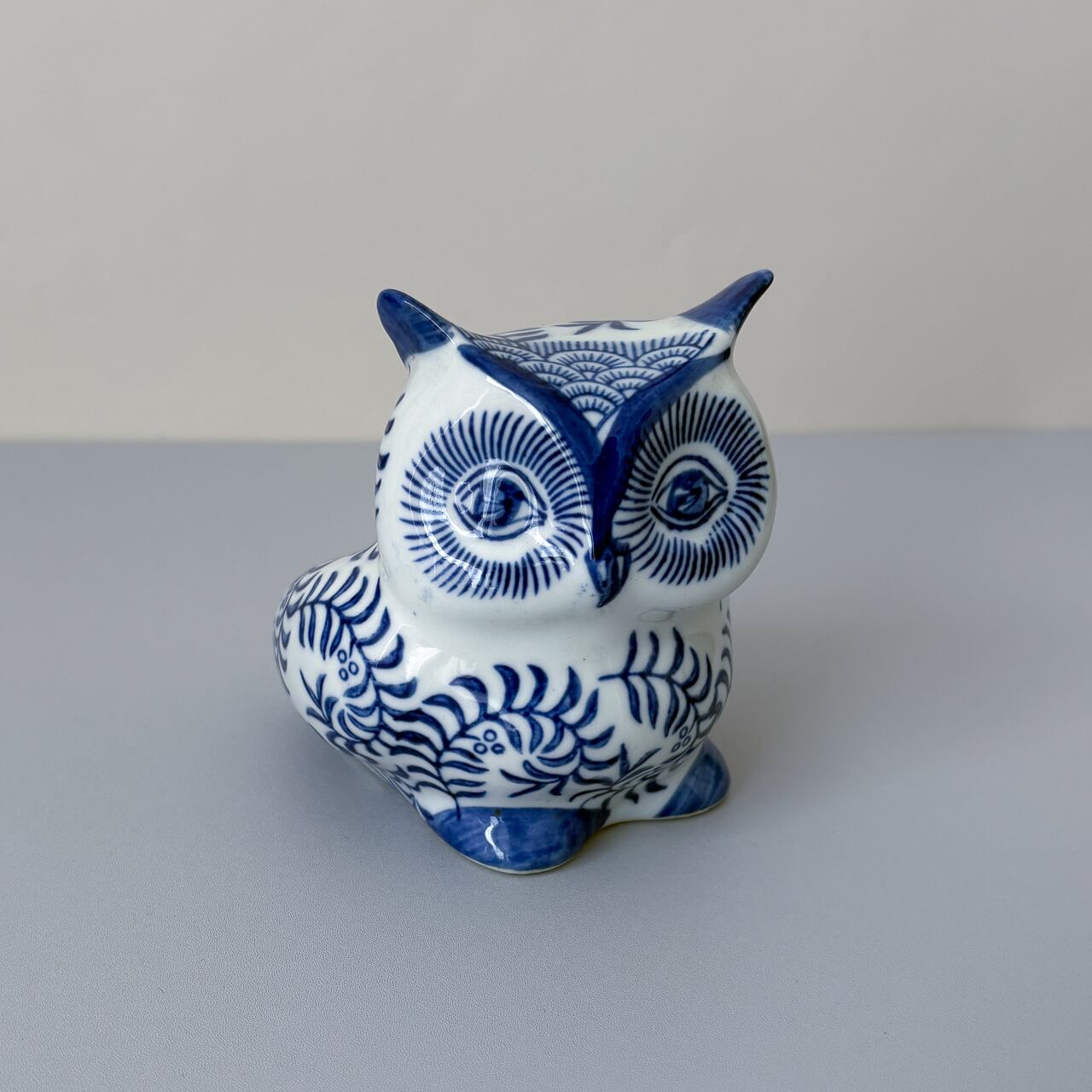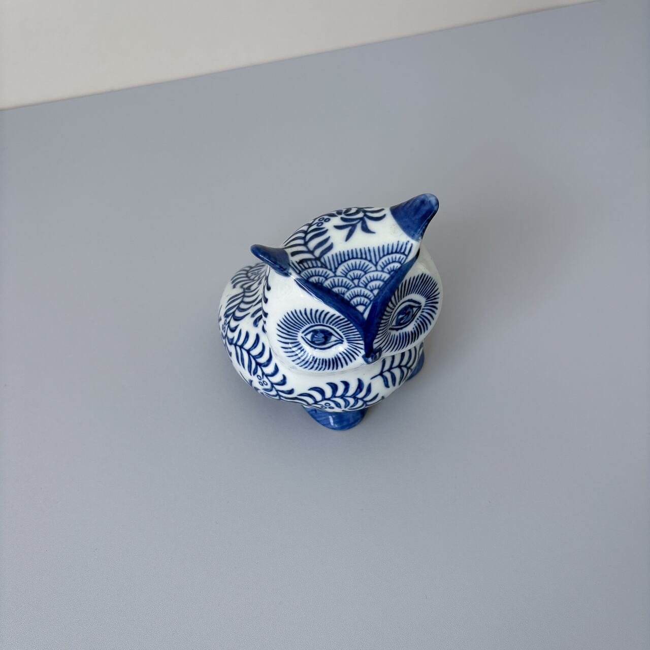 白地に青の蔦柄が美しい、フクロウの貯金箱です。