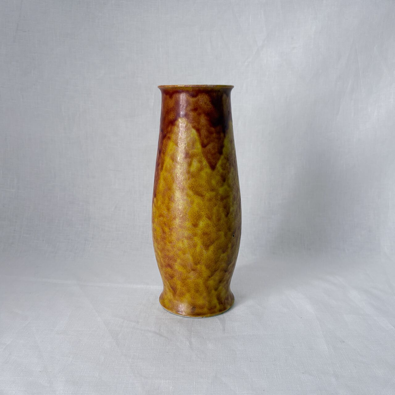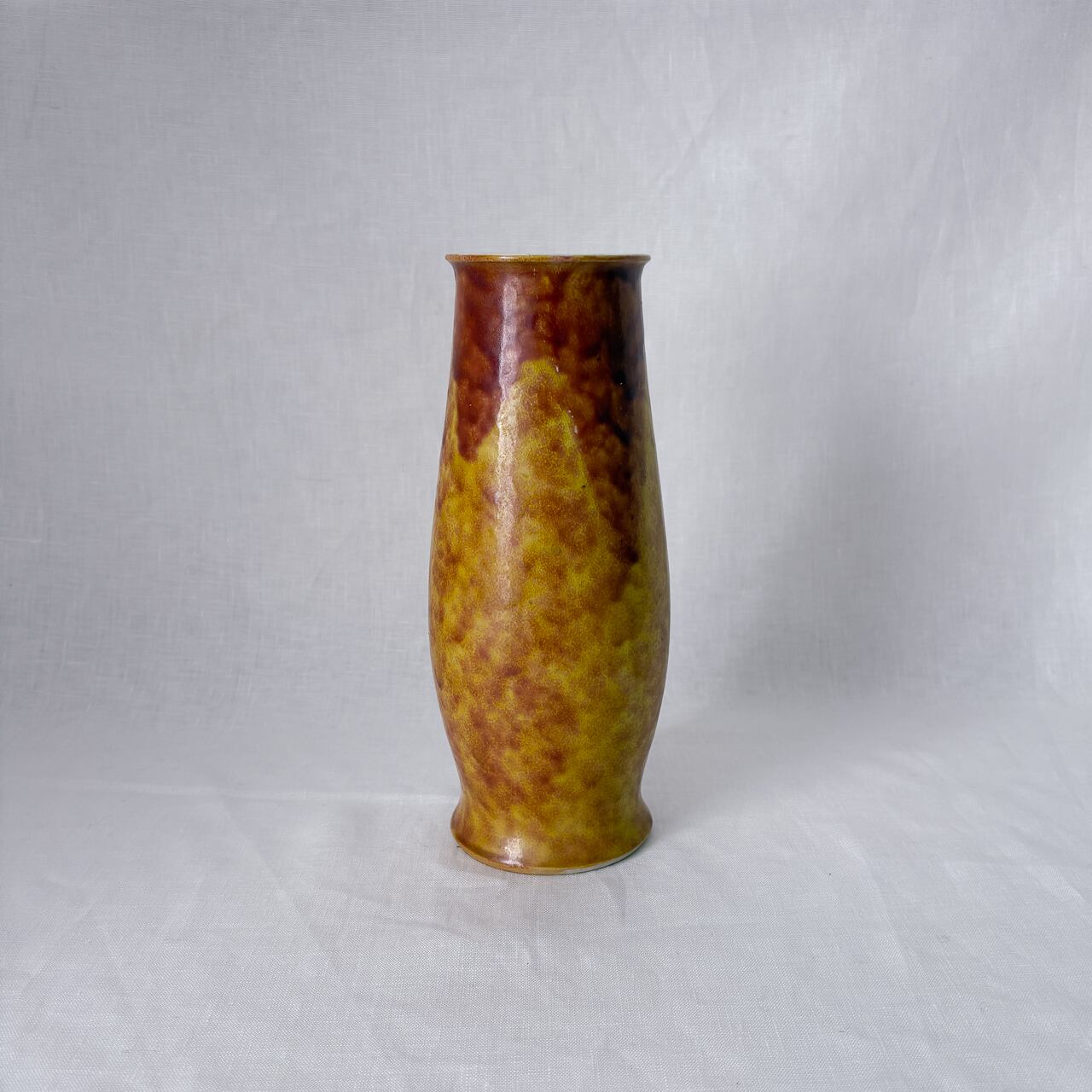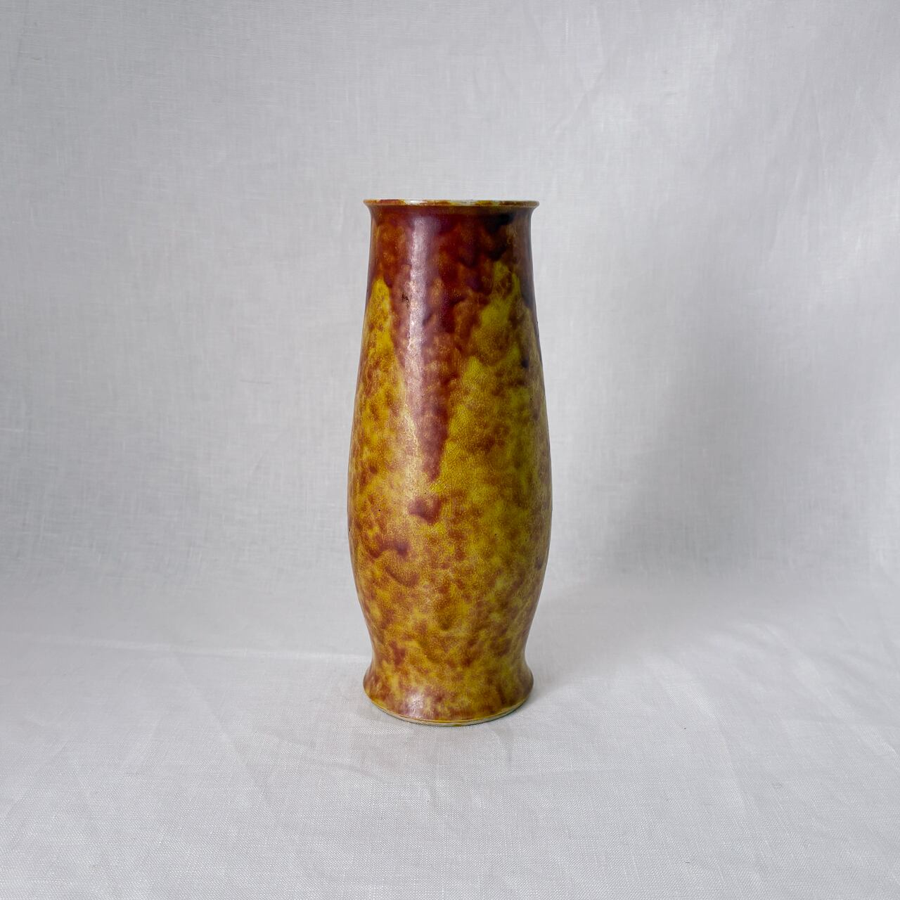 黄色と茶色が混ざり合った釉薬のムラが魅力的な、九谷焼の花瓶です。