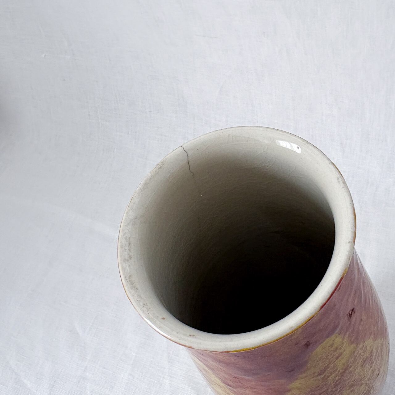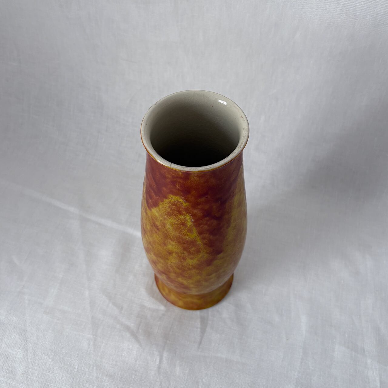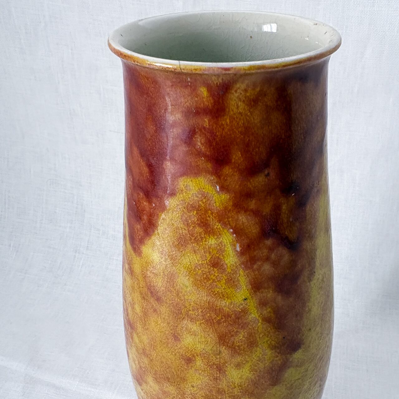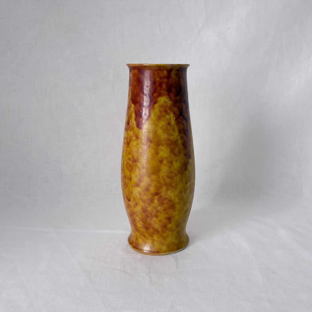 黄色と茶色が混ざり合った釉薬のムラが魅力的な、九谷焼の花瓶です。